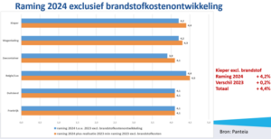 De verwachte kostenstijging exclusief brandstofkostenontwikkeling voor 2024 varieert over de hele linie tussen + 3,8% en + 5,3% ten opzichte van 2023. De gerealiseerde kostenstijging exclusief brandstofkostenontwikkeling van 2023 varieert tussen de + 4,8% en + 8,8%. Dit is een kostenontwikkeling exclusief specifieke marktomstandigheden en brandstofkostenontwikkeling. De gerealiseerde kostenontwikkeling 2023 is in lijn met de raming die in 2022 is afgegeven. De kostenstijging over 2024 tezamen met het verschil tussen realisatie en raming over 2023 varieert daarmee van 3,8% tot 5,1%, exclusief brandstofkostenontwikkeling.